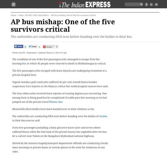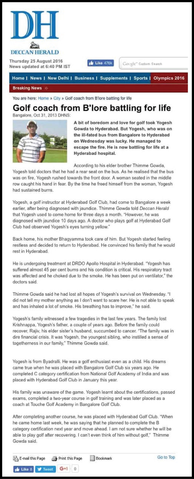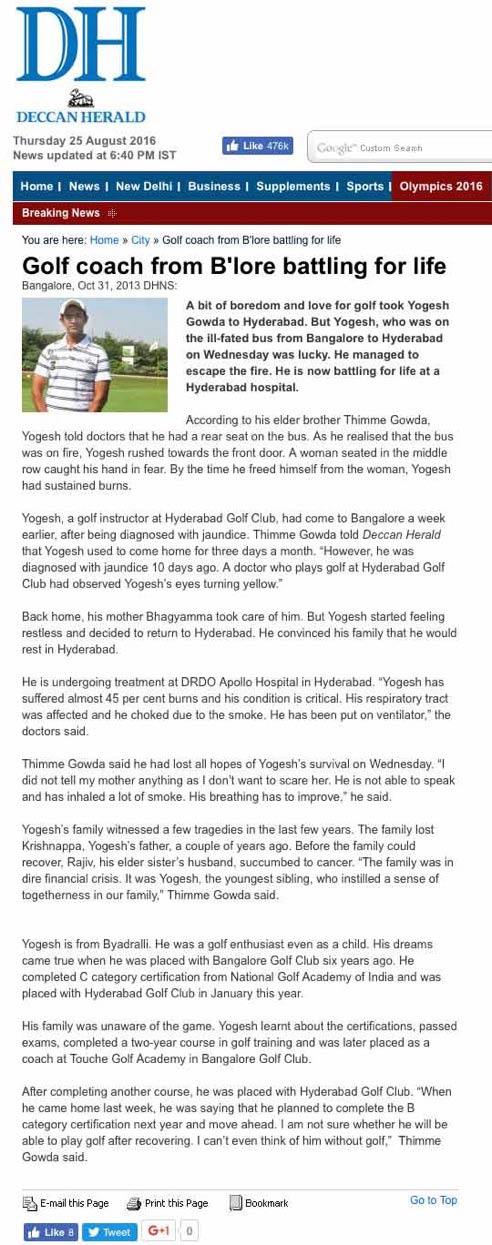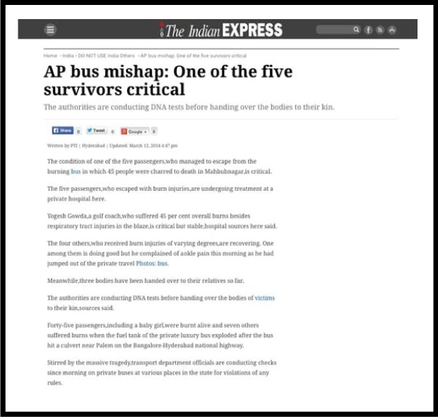 On the 30th of October 2013, Yogesh was traveling from Bangalore to Hyderabad in a Volvo. About 150 kilometers outside Hyderabad, that ill-fated bus caught fire after hitting a culvert on the highway.