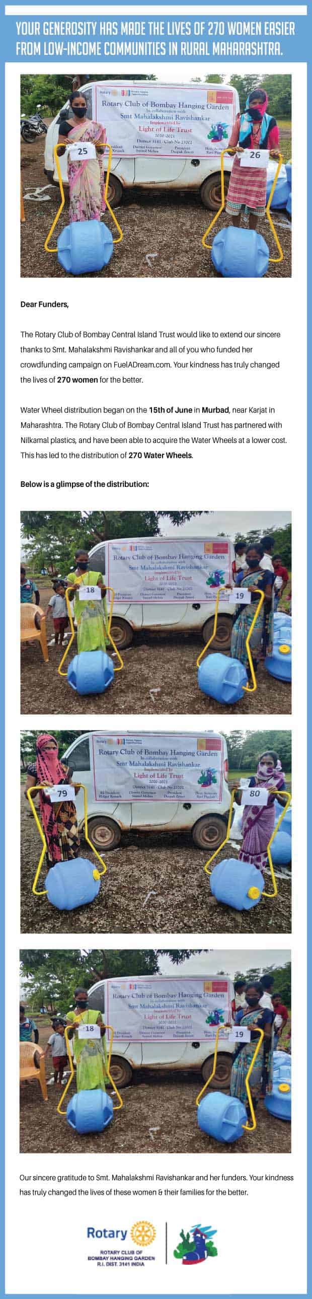 Our family is funding INR 2.5L to support 100 women. Through this campaign, we want to raise more funds to impact more women. This campaign is being done with the reputed Rotary Club of Bombay Hanging Garden and the water wheels will be given to women in rural areas in Maharashtra. There is a demand for approximately 600 water wheels in the areas of Karjat and Nandurbar which would need INR 15L of funding.