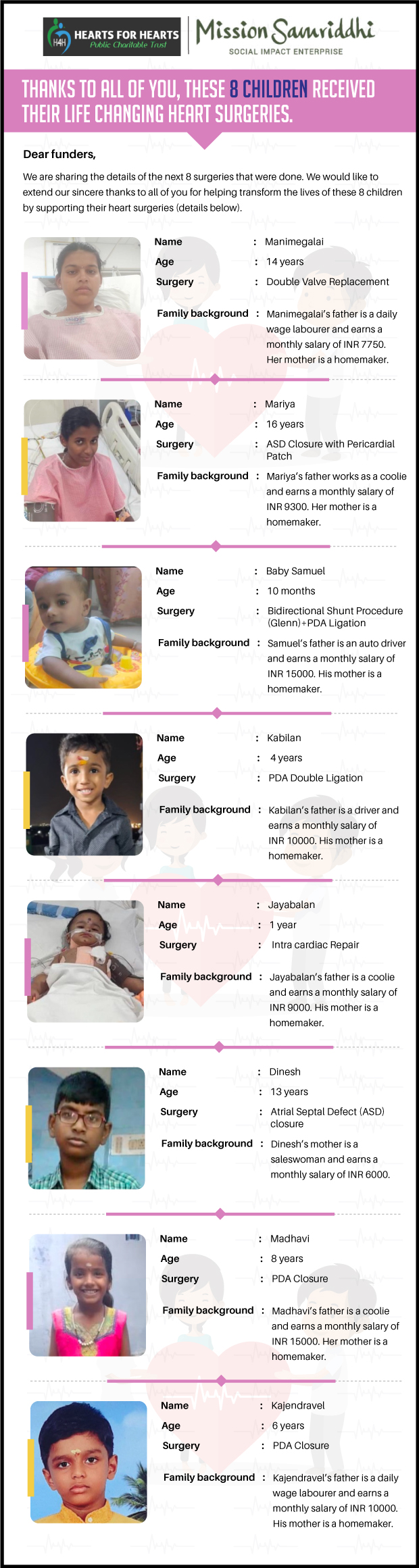 The children are operated in Public Health Centre (PHC) and are accommodated at Udavum Karangal, an NGO near Chennai. The initiative by H4H enables 2 free heart surgeries a week. An average cardiac surgery over here costs INR 1.5L of which INR 1.1L is covered by CMCHIS (Chief Minister’s Comprehensive Health Insurance Schemes), other subsidies & donors. This campaign aims to fund the shortfall of INR 40000 per surgery. I would like to raise INR 20,000 to support a part of the surgery cost or more and help young children.