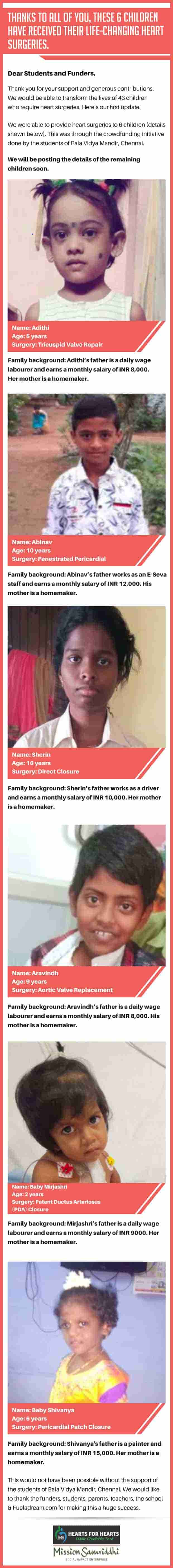 The children are operated in Public Health Centre (PHC) and are accommodated at Udavum Karangal, an NGO near Chennai. The initiative by H4H enables 2 free heart surgeries a week. An average cardiac surgery over here costs INR 1.5L of which INR 1.1L is covered by CMCHIS (Chief Minister’s Comprehensive Health Insurance Schemes), other subsidies & donors. This campaign aims to fund the shortfall of INR 40000 per surgery. I would like to raise INR 20,000 to support a part of the surgery cost or more and help young children.