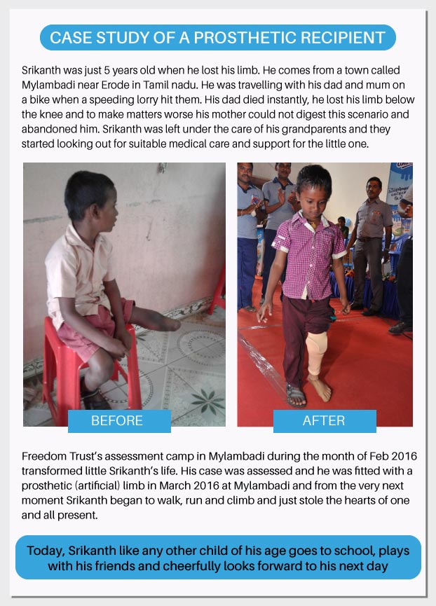 This involves at least 3-4 visits from Chennai to KANYAKUMARI and back. All this is done at a cost of just INR 10000 for a prosthetic limb. Am planning to raise at least INR 20000 so that I can transform the lives of 2 such people and positively impact both them and their families. These people could be kids, adults or the elderly.