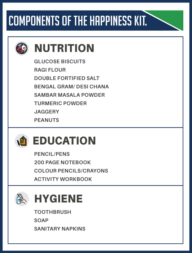 I also want to spread the joy to underprivileged children who go to school and who come from vulnerable low-income communities. Schools being shut has directly impacted children around the country who go to Govt schools. They were dependent on the Mid-Day meal they received every day. These kids are now at home and need nourishment and also something to keep them from boredom. The Happiness kit is the perfect answer and takes care of the multiple needs of these children. This HAPPINESS KIT is being given by the NGO, Akshaya Patra.