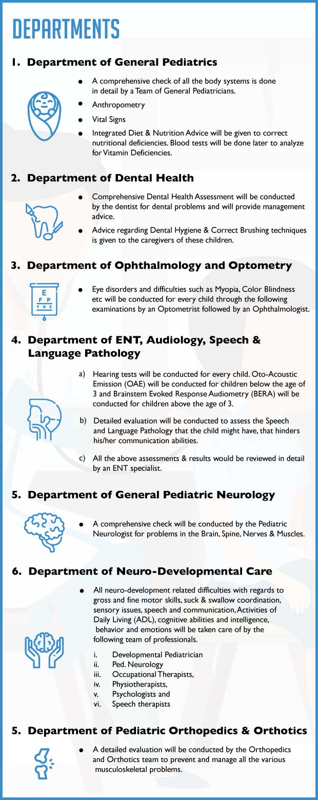 In India, 2.2% of children suffer from disabilities. Though there are no fixed numbers to indicate how many of them are orphans or abandoned, it is reported that many of them are abandoned or orphaned because of their disabilities. In low-income communities, there is generally a lack of preventive screening and awareness of good health practices. This led to a need to comprehensively screen such children at an early age to achieve minimization or preventing diseases.