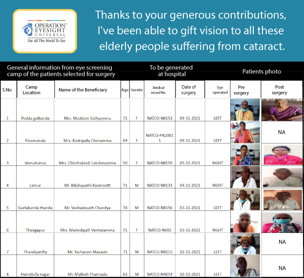 Cataract is a major cause of avoidable blindness in India and other developing countries. Cataract surgeries can restore someone’s vision, restoring their independence and impacting their community overall. Cataract surgeries performed in metro cities like Hyderabad can typically cost between INR 40000 to INR 60000 depending on the cases and complexities, due to the cost of using imported lenses. Operation Eyesight is making these surgeries available at a much lower cost of INR 3000.