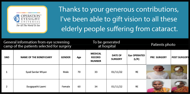 Cataract is a major cause of avoidable blindness in India and other developing countries. Cataract surgeries can restore someone’s vision, restoring their independence and impacting their community overall. Cataract surgeries performed in metro cities like Hyderabad can typically cost between INR 40000 to INR 60000 depending on the cases and complexities, due to the cost of using imported lenses. Operation Eyesight is making these surgeries available at a much lower cost of INR 3000.