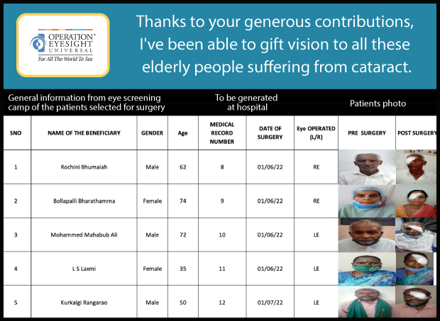 Cataract is a major cause of avoidable blindness in India and other developing countries. Cataract surgeries can restore someone’s vision, restoring their independence and impacting their community overall. Cataract surgeries performed in metro cities like Hyderabad can typically cost between INR 40000 to INR 60000 depending on the cases and complexities, due to the cost of using imported lenses. Operation Eyesight is making these surgeries available at a much lower cost of INR 3000.