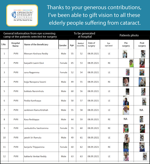 Cataract is a major cause of avoidable blindness in India and other developing countries. Cataract surgeries can restore someone’s vision, restoring their independence and impacting their community overall. Cataract surgeries performed in metro cities like Hyderabad can typically cost between INR 40000 to INR 60000 depending on the cases and complexities, due to the cost of using imported lenses. Operation Eyesight is making these surgeries available at a much lower cost of INR 3000.