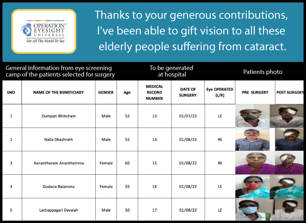 The money raised will be used to provide cataract surgeries for vulnerable seniors (usually 65+ years) in and around Hyderabad, Secunderabad, Warangal and Rangareddy district.