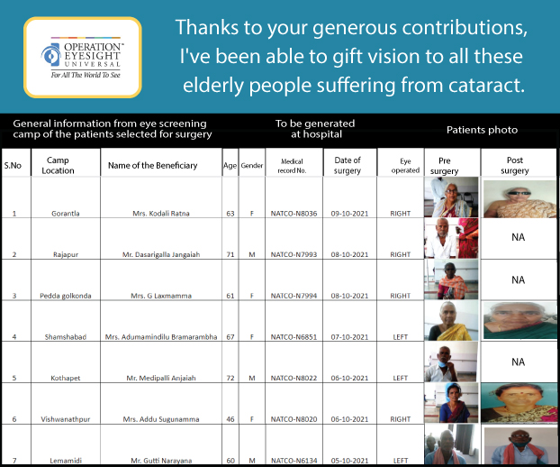 Cataract is a major cause of avoidable blindness in India and other developing countries. Cataract surgeries can restore someone’s vision, restoring their independence and impacting their community overall. Cataract surgeries performed in metro cities like Hyderabad can typically cost between INR 40000 to INR 60000 depending on the cases and complexities, due to the cost of using imported lenses. Operation Eyesight is making these surgeries available at a much lower cost of INR 3000.