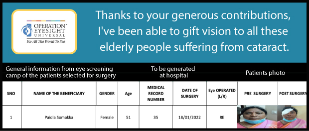 Cataract is a major cause of avoidable blindness in India and other developing countries. Cataract surgeries can restore someone’s vision, restoring their independence and impacting their community overall. Cataract surgeries performed in metro cities like Hyderabad can typically cost between INR 40000 to INR 60000 depending on the cases and complexities, due to the cost of using imported lenses. Operation Eyesight is making these surgeries available at a much lower cost of INR 3000.