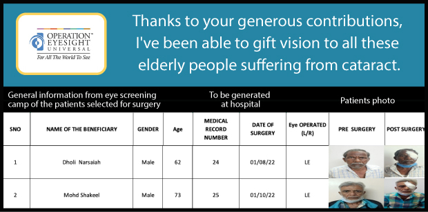 Cataract is a major cause of avoidable blindness in India and other developing countries. Cataract surgeries can restore someone’s vision, restoring their independence and impacting their community overall. Cataract surgeries performed in metro cities like Hyderabad can typically cost between INR 40000 to INR 60000 depending on the cases and complexities, due to the cost of using imported lenses. Operation Eyesight is making these surgeries available at a much lower cost of INR 3000.
