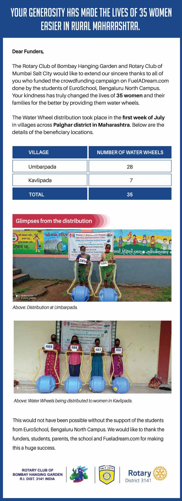Please support my campaign and let us together bring joy to more women. The Water wheels will be distributed by the team from the Rotary Club of Hanging Gardens with their local partners. The cost of doing this (including identifying the women, the cost of the water wheel, the actual distribution ) is only INR 2500 per water wheel making it truly a revolutionary idea.