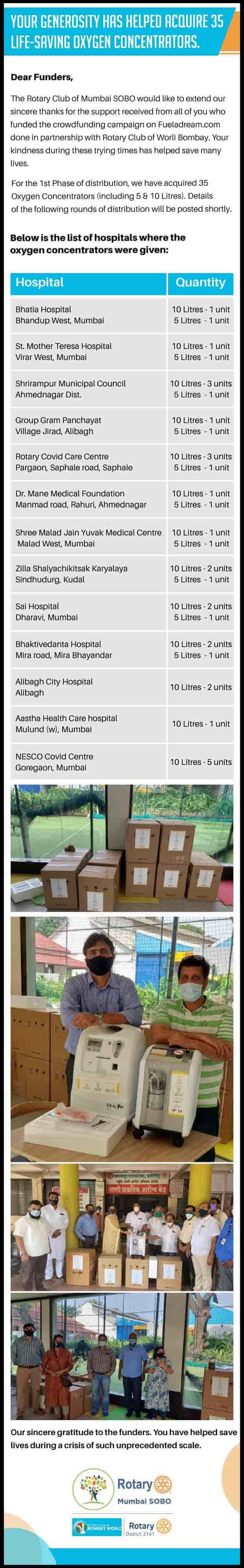 This campaign is being done in partnership with Rotary District 3141 which has identified the need for Oxygen Concentrators in Mumbai.