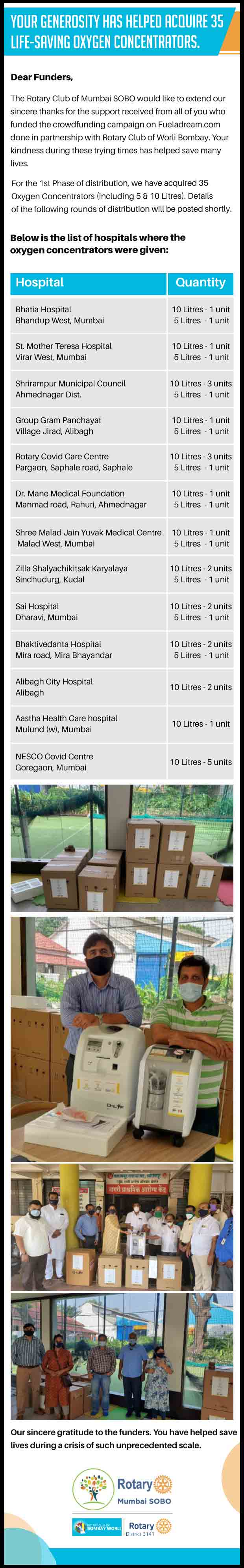 This campaign is being done in partnership with Rotary District 3141 which has identified the need for Oxygen Concentrators in Mumbai.