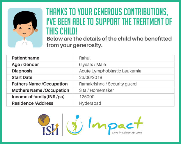IMPACT has a tie-up with the Shivananda Trust, Hyderabad and the treatment will be done at the new “KUMUDINI IMPACT PEDIATRIC CANCER CENTRE". All funding has 80G tax benefits.