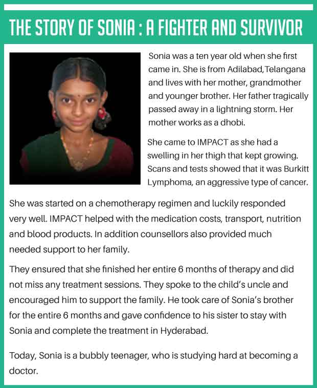 IMPACT (Improving Access To Care and Treatment) is a Hyderabad-based NGO that has been actively working with children like Sonia in Hyderabad for the last 13 years. They have started an initiative with Shivananda Trust to set up the KUMUDINI IMPACT PEDIATRIC CANCER CENTRE by JULY 2021 that will provide treatment, accommodation and transport free of cost to children. The centre plans to treat 50 children with blood cancer in the year 2021-22 and achieve a cure rate of 85%.