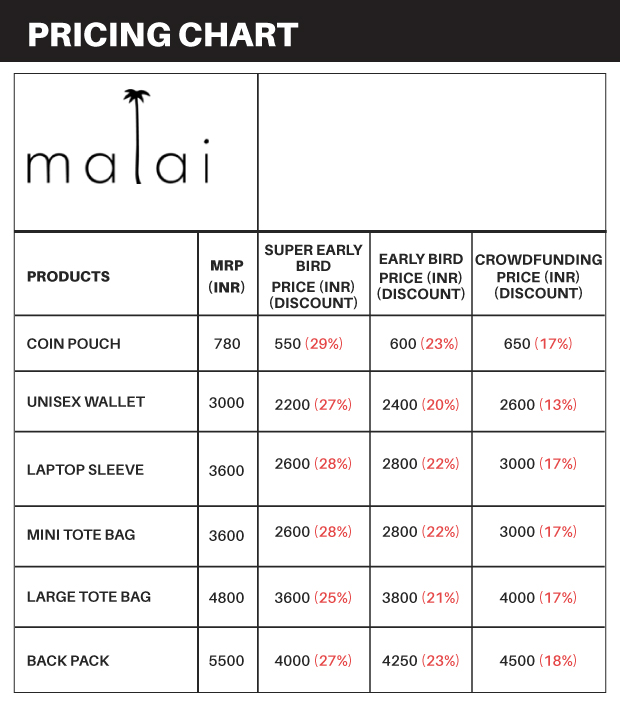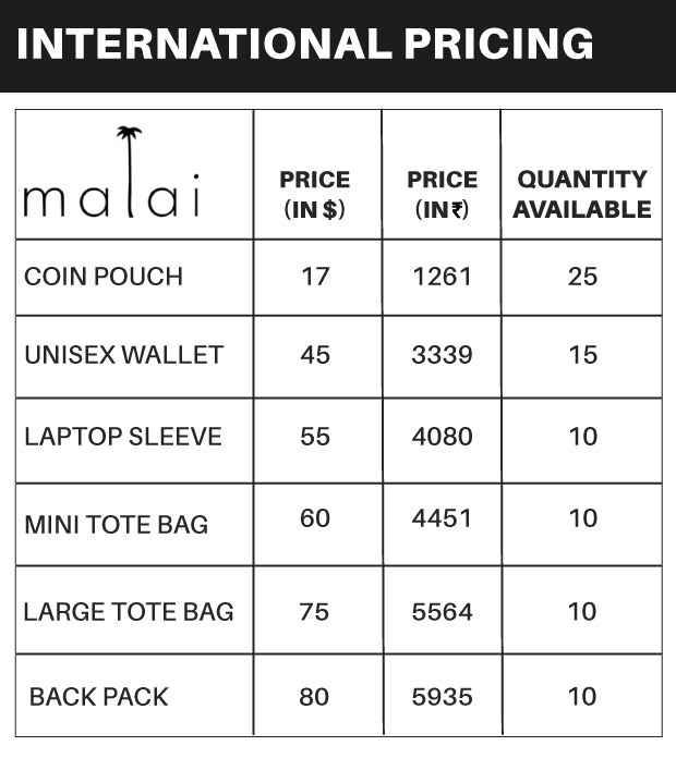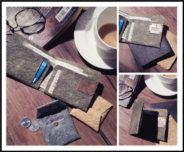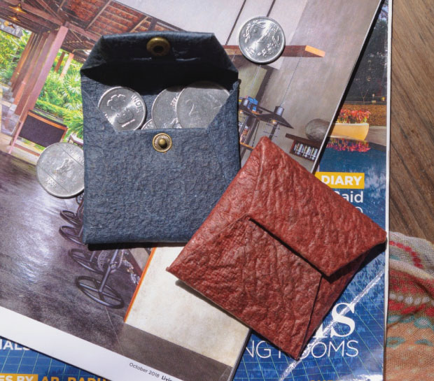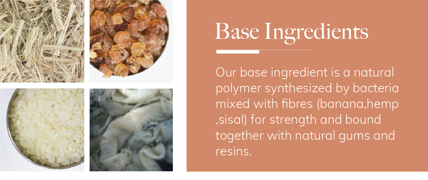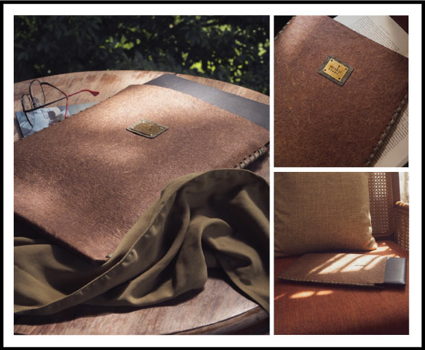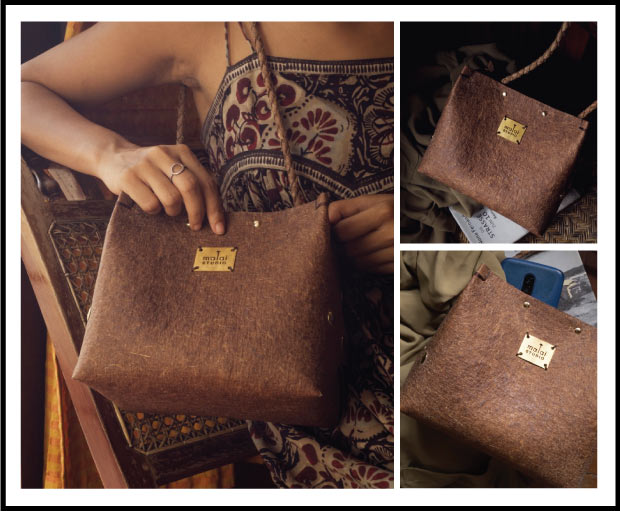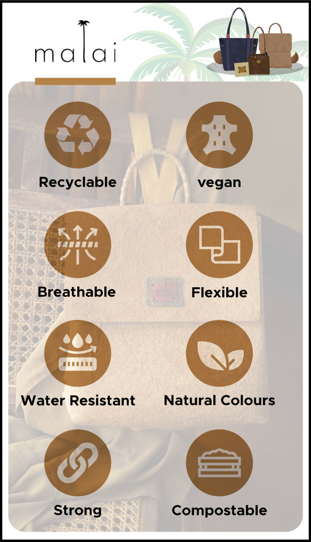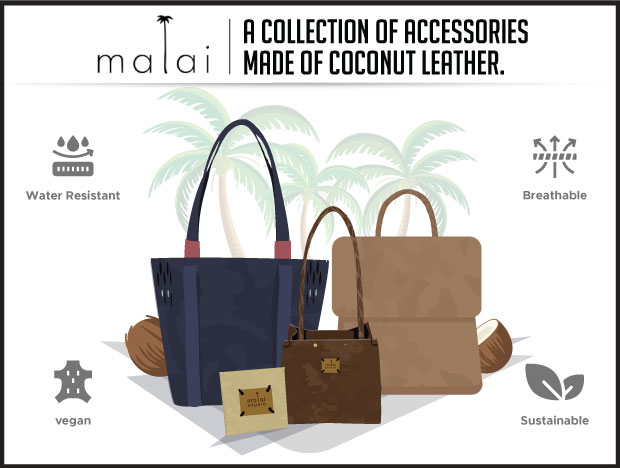 Malai is a novel biocomposite material developed by Malai Biomaterials (us) in Kerala. It's based on Bacterial Cellulose grown on waste water from mature coconuts, plant fibres and natural gums. It can serve as an alternative to animal leather in applications such as accessories, light footwear and home interiors.