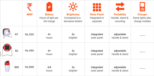 The models of solar lamps that we can install in homes with their current MRP in ₹.Images courtesy d.light SOLAR