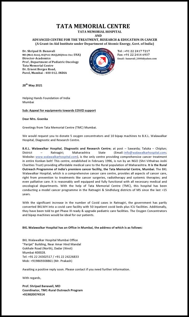 Giving critical medical equipment such as Oxygen Concentrators and BiPAP machines will help provide quality treatment to them. These will help save the lives of critical patients and all those with low oxygen levels.