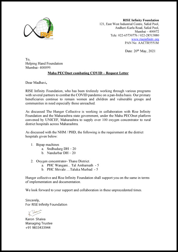 The Helping Hands Foundation is a non-profit organization. The Helping Hands Foundation has facilitated more than 100,000 masks, 15000 plus PPE kits and over 200,000 units of food items and is providing shelter to over 200 families at 3 shelter homes. Helping Hands Foundation continues to provide need-based aid to Covid-19 Hospitals, Vaccination Centres and workers, across marginalised communities for ration, Oxygen Concentrators, BiPAP machines, masks, rapid test kits and oximeters in Mumbai and rural Maharashtra.