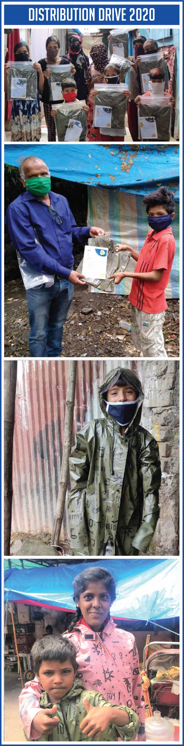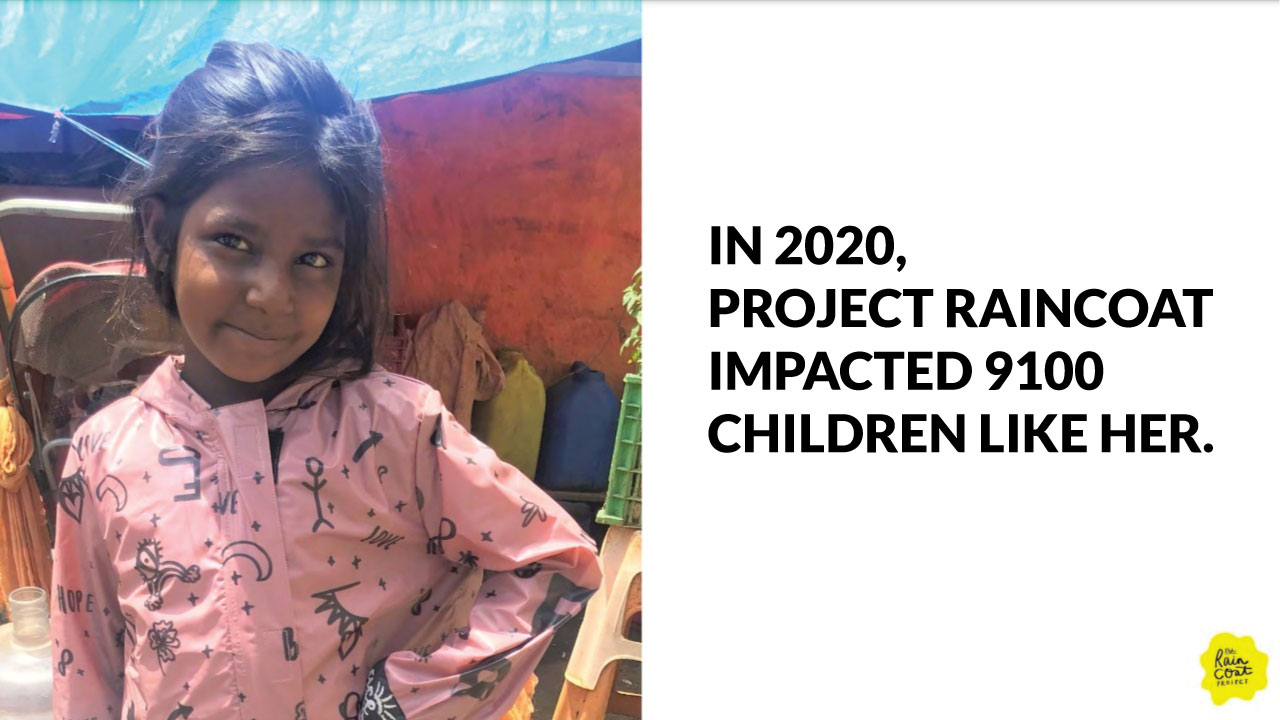They will be given to street kids and kids in municipal schools. Geographically, they will be given in Dharavi, Sonapur, BanGanga, Kurar & Powai. The raincoats use recycled material, have a unisex design, come in 6 sizes & have cool hoodies.
