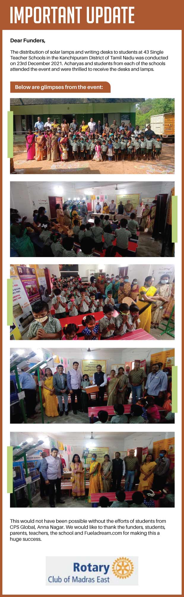 Funding for this campaign is eligible for tax breaks as ROTARY CLUB OF MADRAS EAST is a registered trust and you can avail of benefits under section 80G of the IT act. Foreign funding is NOT accepted.