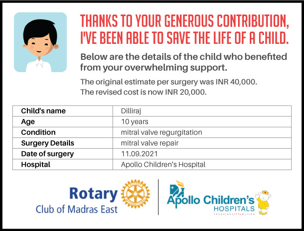 The Apollo Children's Hospital in Chennai is performing these surgeries at a much much lower cost of between INR 1.10L - INR 1.85L depending on the complexity. Grants and other donors and subsidies from paid surgeries will take care of part of the costs. We need just INR 40000 to make one surgery happen.