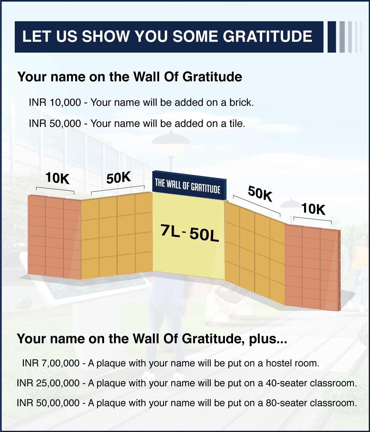 We will forever recognise your generosity on the wall of gratitude, located at the Chinmaya University campus. Your legacy will be marked for generations to see.
