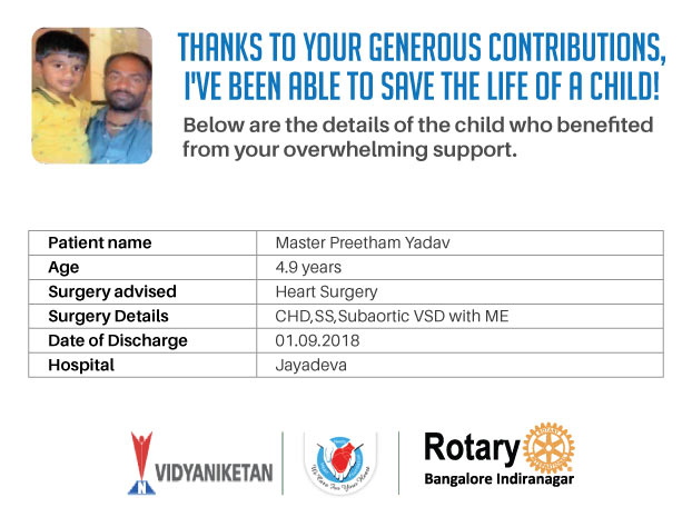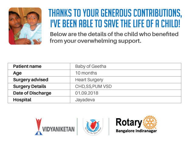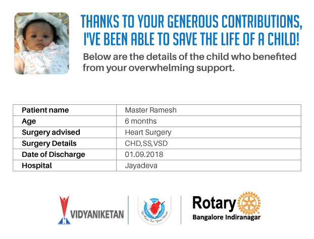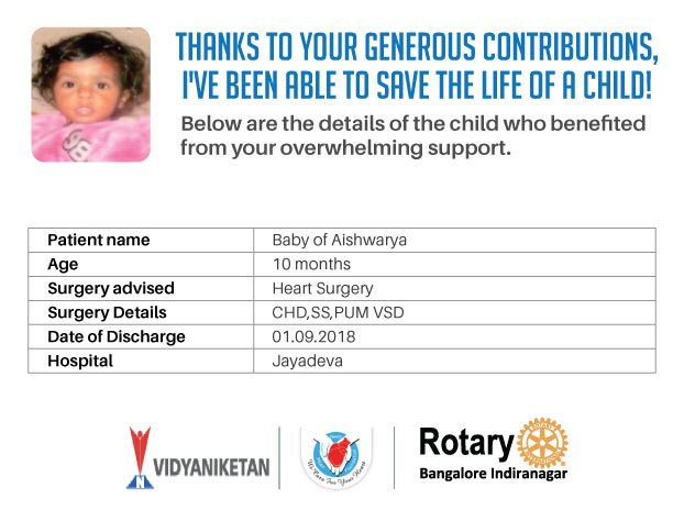 The money raised will be given directly after the campaign ends to the Rotary Bangalore Indiranagar. They will then fund surgeries at the JAYADEVA hospital with Needy Heart Foundation and save the life of a poor child and share the details with me. I shall then send you an update about the child we have saved so that you know where your money has gone.