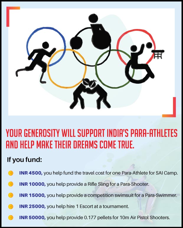 I have undertaken this campaign because being able to support the Indian Para-Athletes who have made our country proud is incredible. Para-sports is extremely capital intensive. Costs for obtaining personalised equipment, training and costs for travel, visa, stay etc. for the athletes is very expensive. Hence with our support, the profile and performance of India’s Paralympic athletes can be strengthened. This will help them achieve their dreams at the national and international events.