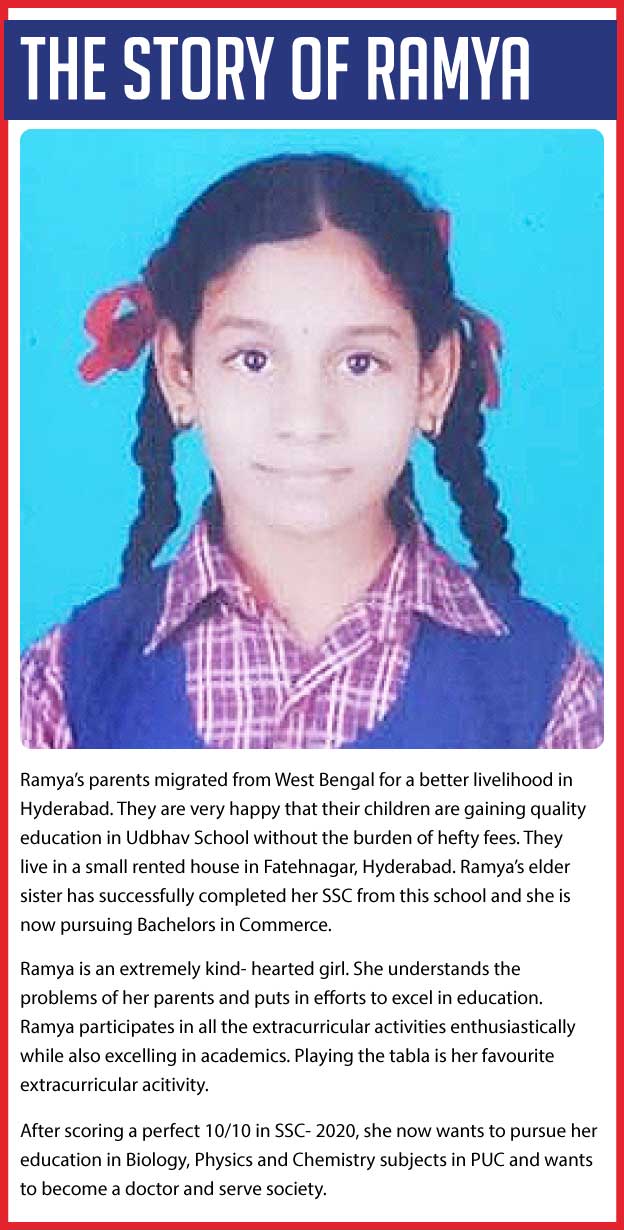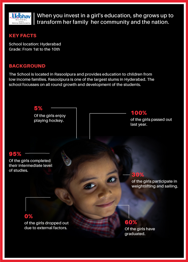 The UDBHAV SCHOOL in Hyderabad is a very unique school that provides high quality ENGLISH MEDIUM education to students mainly from the slums of Hyderabad. Majority of the students are girls. Supporting a girl impacts not just her but her family for generations. The school is proudly managed by the IIM(A) Alumni Association (Hyderabad Chapter). Just INR 28000 will help educate them for a year and includes the cost of school, uniforms, books, mid-day meals etc.