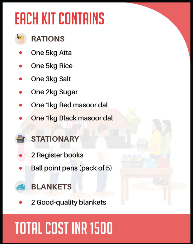 Through this campaign, we aim to help them by giving them a kit that contains rations for a month, blankets, books and stationary. Each kit costs just INR 1500. This will help give them comfort, improve their health and boost their attendance.