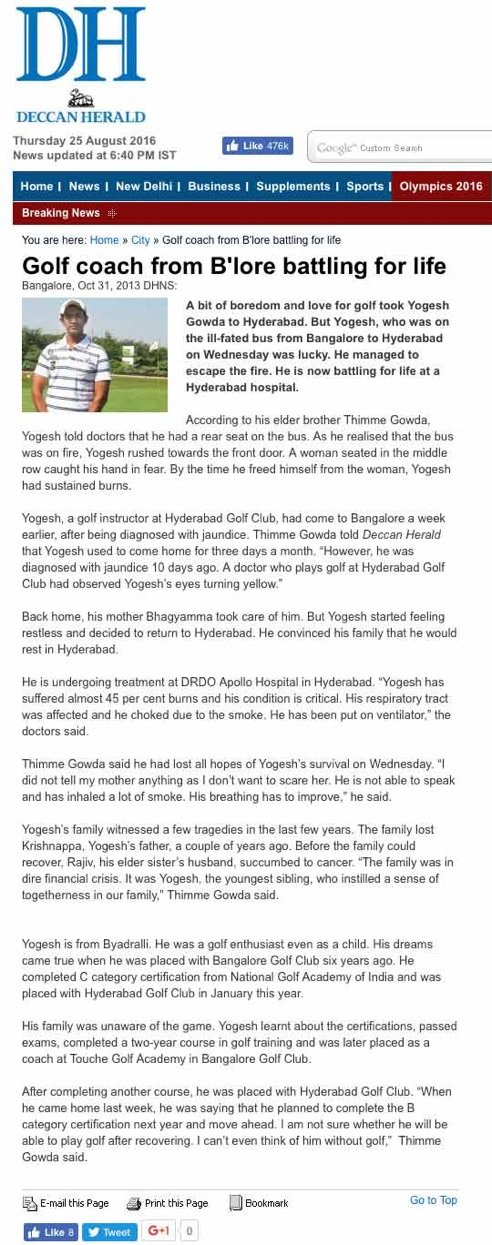 Yogesh was a promising C-category certified golf coach at one of India’s top golf courses in Hyderabad - The HGA (Hyderabad Golf Association). He learned his golf as a caddy first. He then coached at Bangalore Golf Club before moving to Hyderabad. A horrific accident involving a Volvo bus on the Bangalore - Hyderabad highway turned his life upside down. He had 45% burns & almost died. But his fighting spirit & will to live ensured that he fought for his life. He now is very badly disfigured and 8 of his fingers have been amputated.
