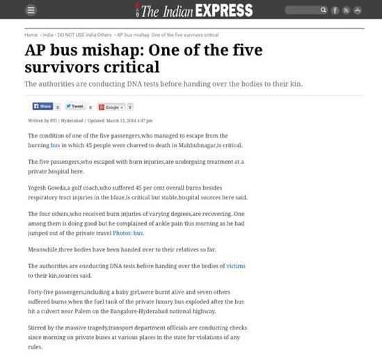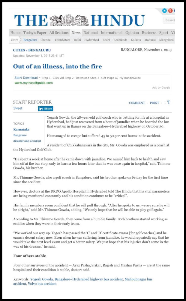 On the 30th of October 2013, Yogesh was traveling from Bangalore to Hyderabad in a Volvo. About 150 kms outside Hyderabad, that ill-fated bus caught fire after hitting a culvert on the highway. More than forty people died, and just five passengers survived, all thanks to Yogesh’s presence of mind & efforts to kick open the emergency door. However, he suffered 45% burns and was in DRDO Apollo Hospital in Hyderabad for 4 months fighting for his life.
