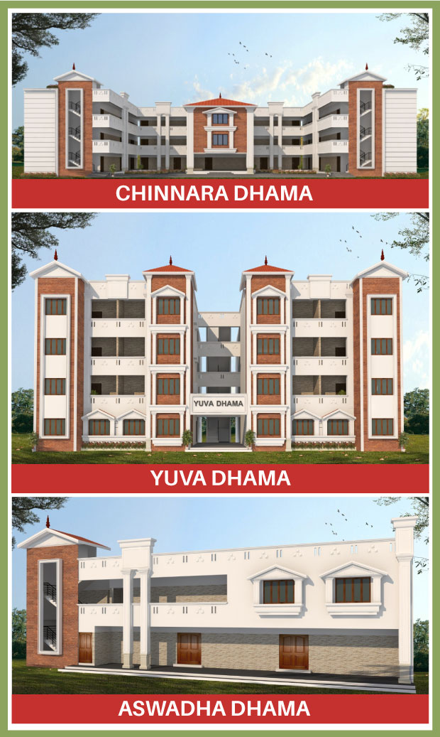 - Aswadha Dhama (Kitchen, Dining and Multi-purpose hall, Library, Computer lab etc).