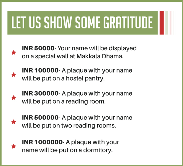 We will forever recognise your generosity on the wall of gratitude, located at the Makkala Dhama campus. For those of you who want to fund large amounts, we would like to recognise your generosity so that your legacy will be marked for generations to see.
