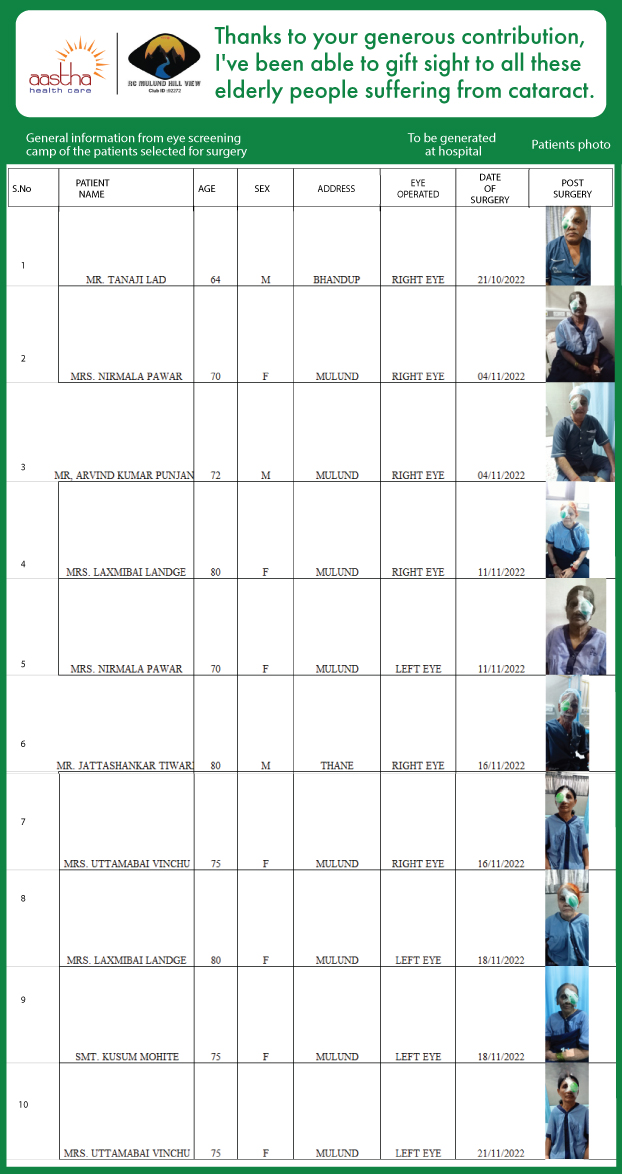 Rotary Club of Mulund Hill View, Aastha Health Care and Motwani Charitable Trust have joined hands since 2005 to carry out Cataract Surgeries for poor patients who are unable to afford this surgery.