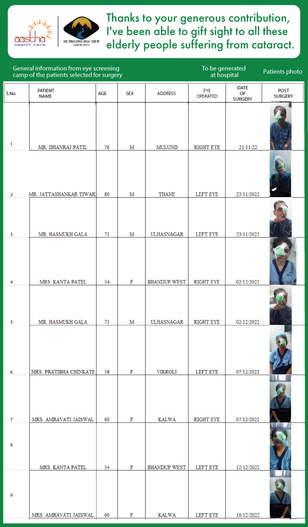 Rotary Club of Mulund Hill View, Aastha Health Care and Motwani Charitable Trust have joined hands since 2005 to carry out Cataract Surgeries for poor patients who are unable to afford this surgery.