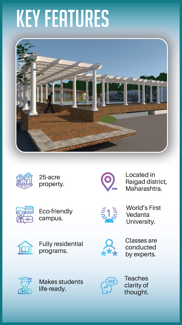 The proposed university will be constructed on a 25-acre property in Raigad district, Maharashtra. The university will impart liberal education. Students will be trained to be life-ready, not just career-ready through fully residential undergraduate, postgraduate, and doctorate programs. The UG and PG programs are designed by experts based on the Vedanta system of education. Diploma, short-term courses, and certificate courses are also offered.