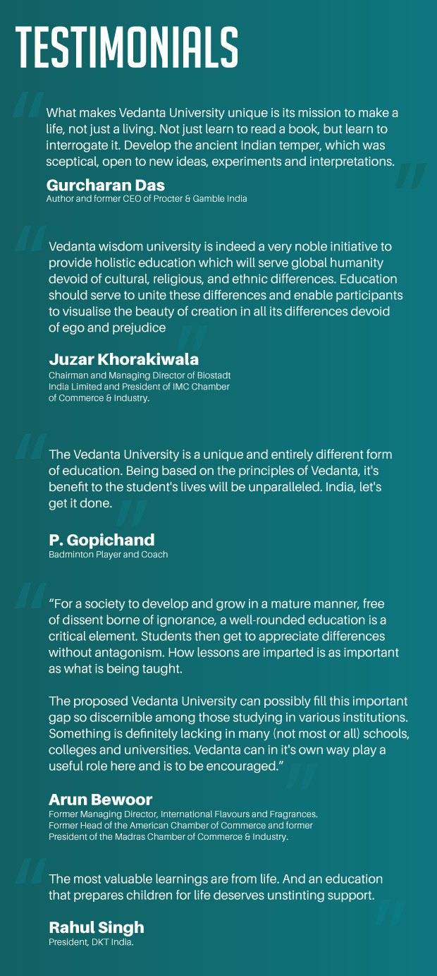 I have undertaken this campaign because I believe that the right education is the foundation for life’s journey. I was fascinated by the approach of this first-of-its-kind university - THE VEDANTA WISDOM UNIVERSITY and the impact it will make.