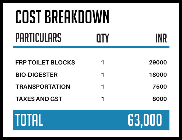 The total cost to construct a Bio-Toilet is INR 63000. The Bio-Toilet is constructed using Tiger Toilet Technology.