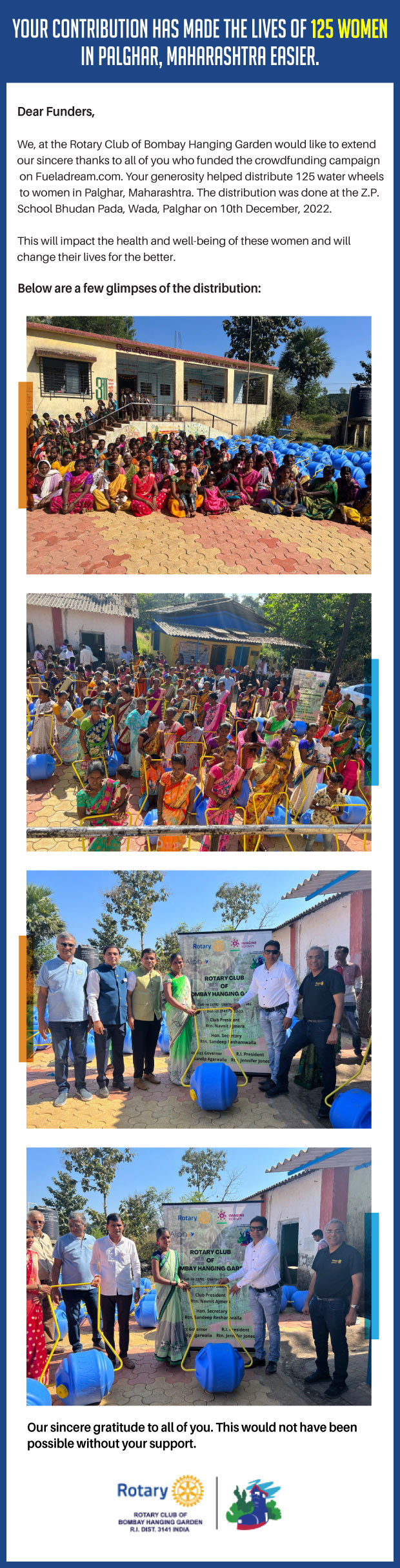 Please support my campaign and let us together bring joy to more women in Karjat and Palghar. The Water wheels will be distributed by the team from the Rotary Club of Hanging Gardens with their local partners. The cost of doing this (including identifying the women, the cost of the water wheel, and the actual distribution) is only INR 3000 per water wheel making it truly a revolutionary idea.