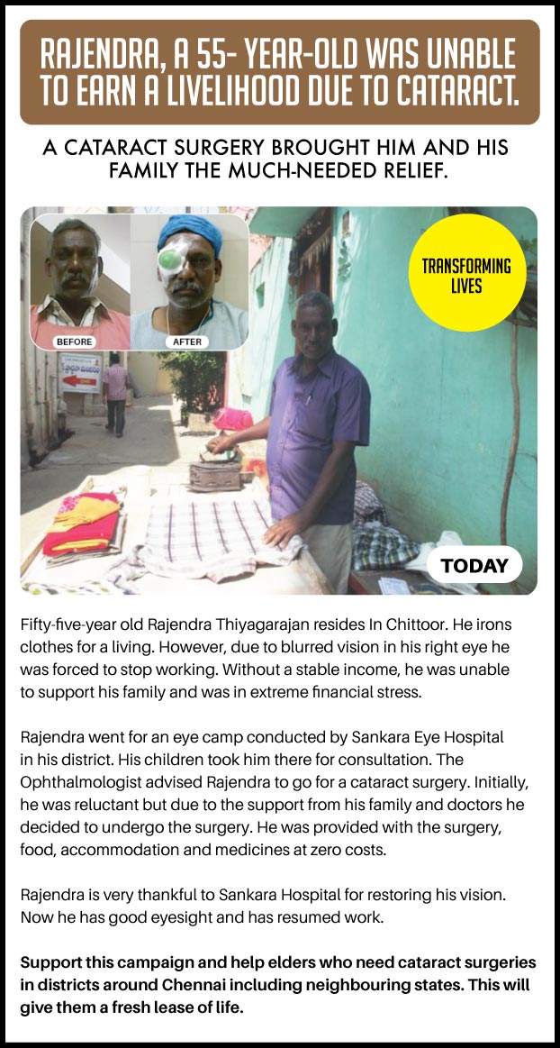 I cannot imagine what it is to go blind. The fact that a contribution of just Rs 2000 can make a difference to the life of someone and give them back their sight made me realise that I must do something to help. I was really surprised that it takes just INR 2000 to make a difference at the Sankara Eye Hospital at Pammal, Chennai. It not just restores vision for them but also improves the quality of life for needy people.