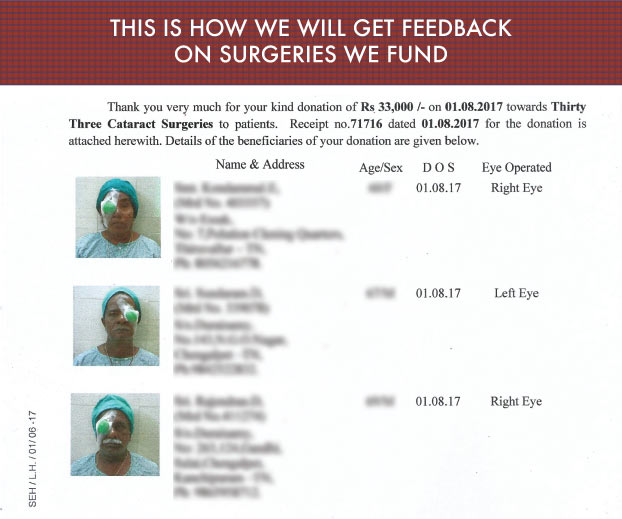 The money raised will be used to provide cataract surgeries for vulnerable seniors (usually 65+ years) in areas around Chennai including neighbouring states.