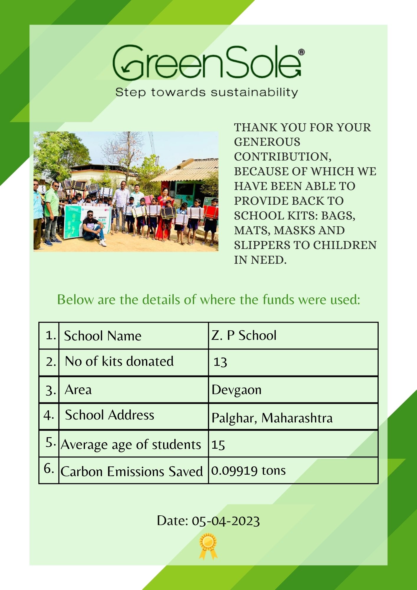 The distribution will take place in schools across Maharashtra. Greensole is located in Navi Mumbai, Maharashtra.