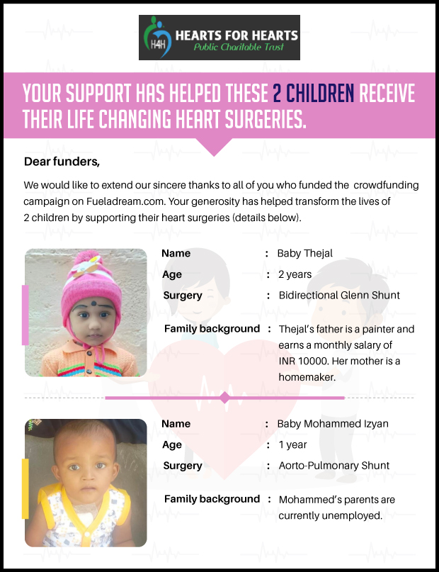 The Chennai based NGO Hearts for Hearts Charitable Trust (H4H) is performing these surgeries at a much lower cost of INR 60000 to 1.5L depending on the case and complexity. Funds from voluntary donors and organizations will take care of a part of the costs. This campaign aims to fund the shortfall of INR 40000 per surgery.