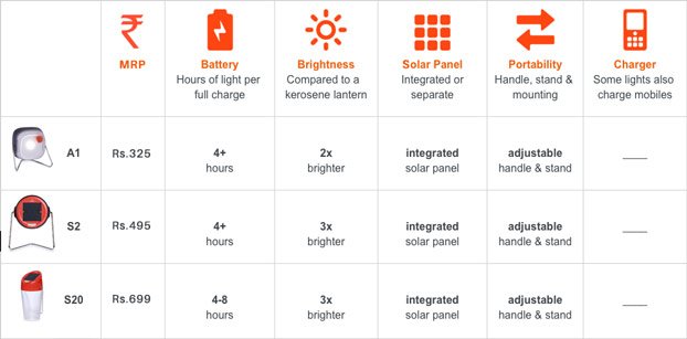 Image: The different models of solar lamps that we can install in home with their current MRP in INR. Images courtesy d.light SOLAR