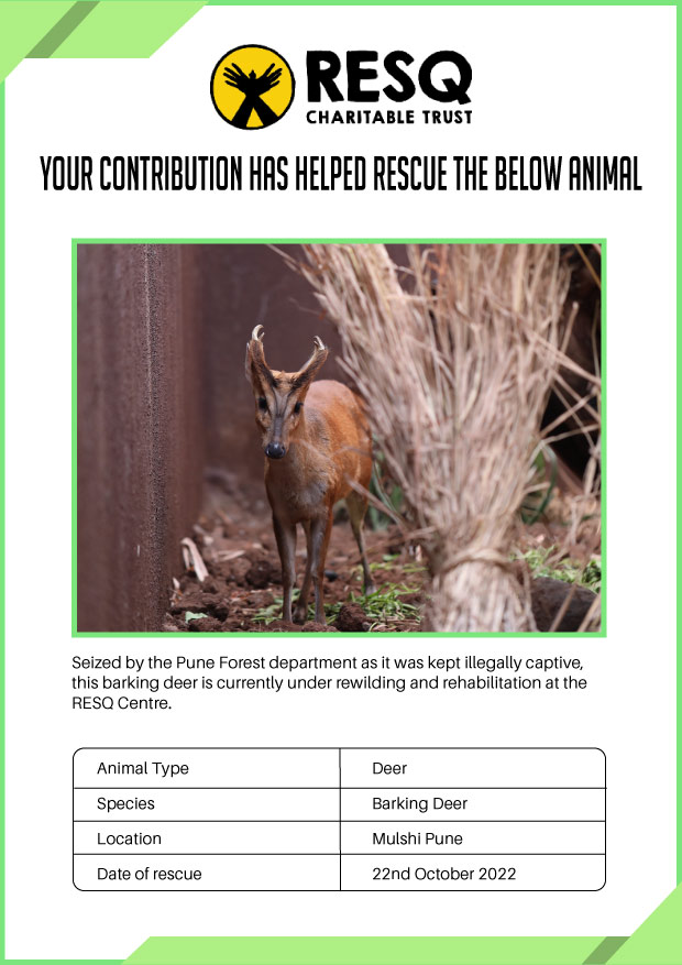Maharashtra is home to a diverse population of wild animals, many of whom are key species identified to be globally declining. The Pune-based NGO - RESQ provides emergency aid to animals in distress. Thousands of wild animals come to RESQ annually who are either injured, sick, orphaned, or victims of wildlife trafficking and illegal captivity.