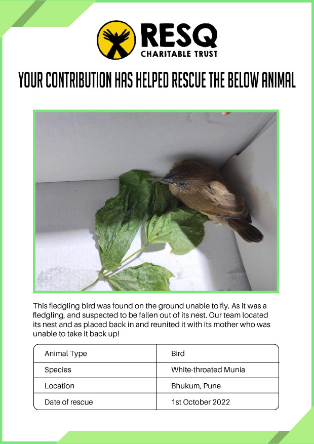 RESQ was founded in 2007 to provide emergency aid to animals in distress. Since then, the rescue and rehabilitation work of the organisation has provided aid to thousands of animals of over 200+ species, improved public health and safety outcomes, and actively worked on preventing human-animal conflict across multiple urban and rural ecosystems.
