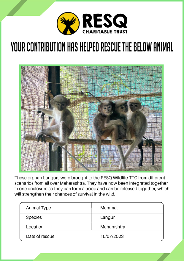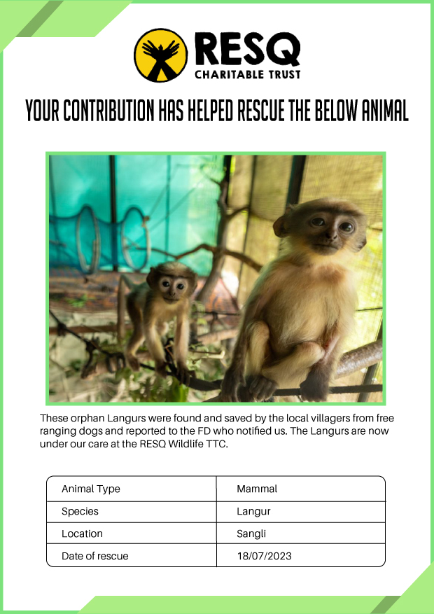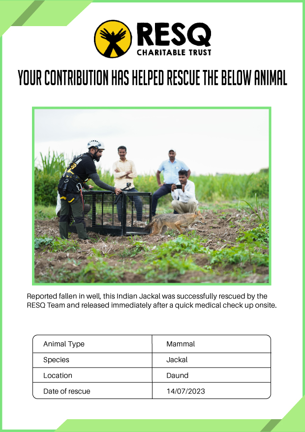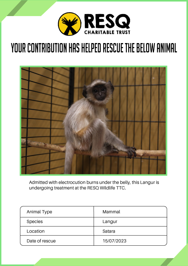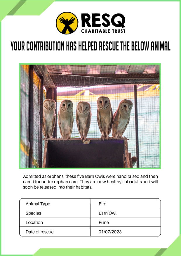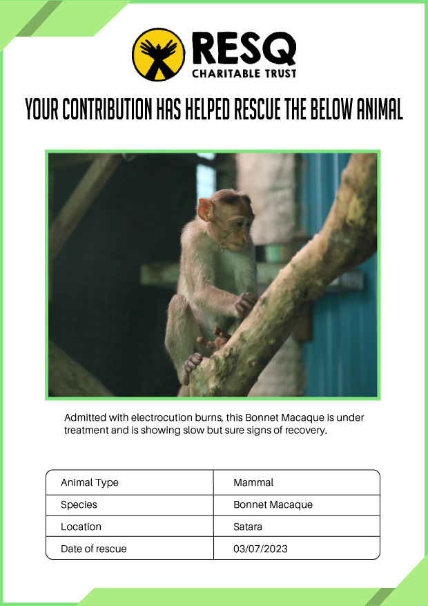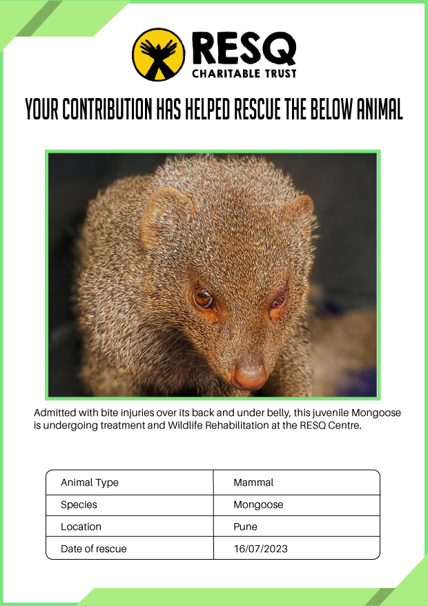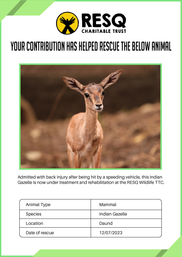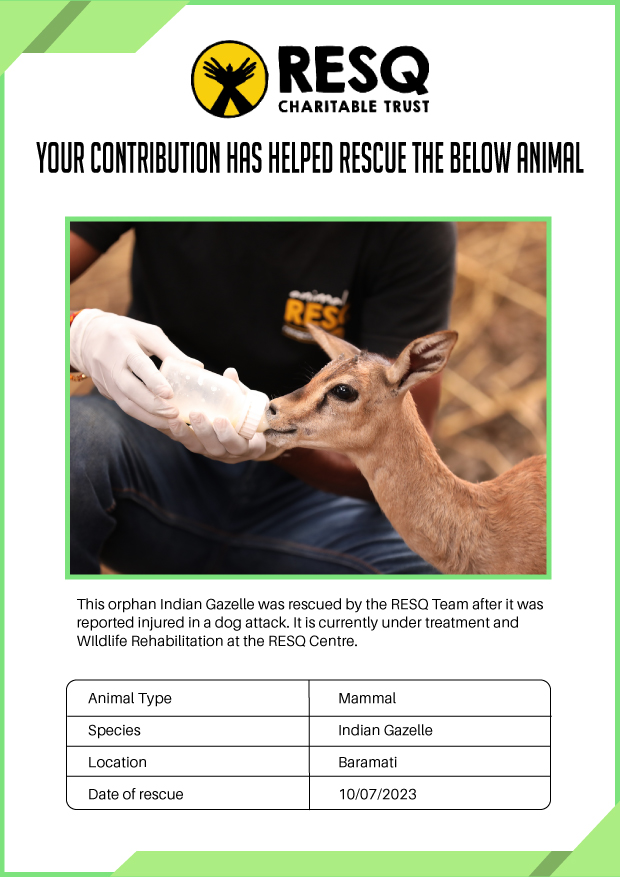 RESQ was founded in 2007 to provide emergency aid to animals in distress. Since then, the rescue and rehabilitation work of the organisation has provided aid to thousands of animals of over 200+ species, improved public health and safety outcomes, and actively worked on preventing human-animal conflict across multiple urban and rural ecosystems.